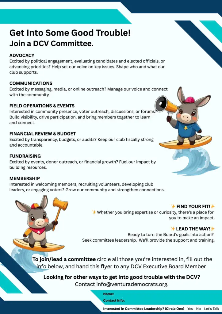 You do not need to be a dues-paying member or a seasoned activist to join us. Whether you’re a lifelong Democrat, a curious neighbor, or someone looking to get more involved in the Ventura community for the first time, we invite you to pull up a chair.